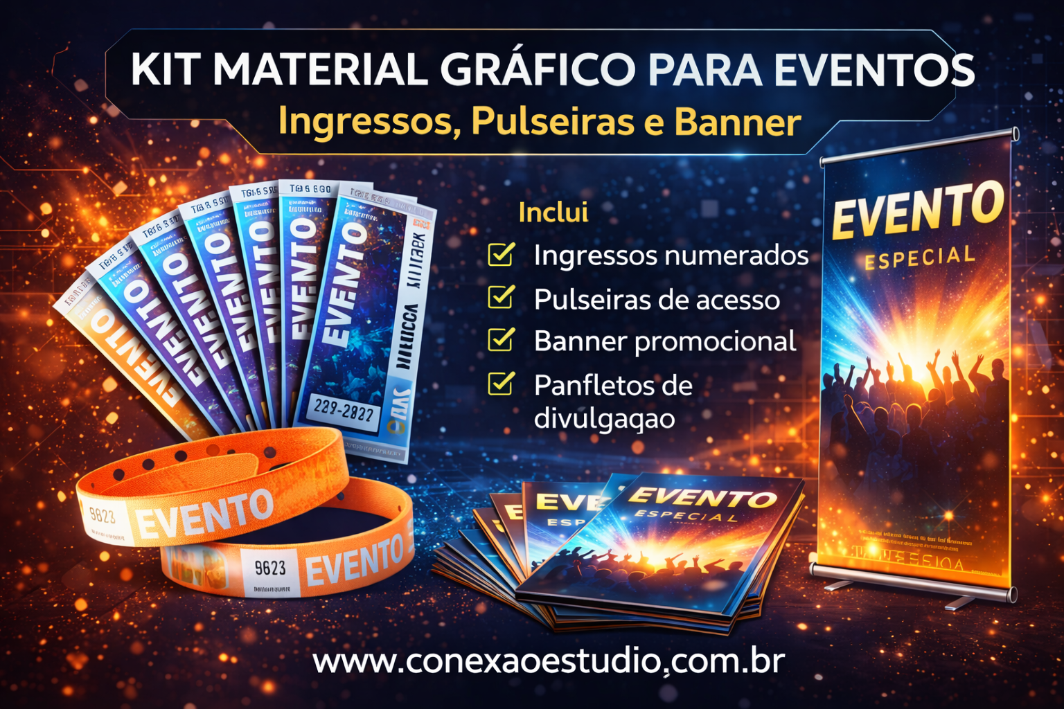 Esse kit reúne materiais essenciais para divulgação, controle de acesso e identificação de participantes, sendo ideal para festas, shows, eventos corporativos, congressos e campanhas promocionais.