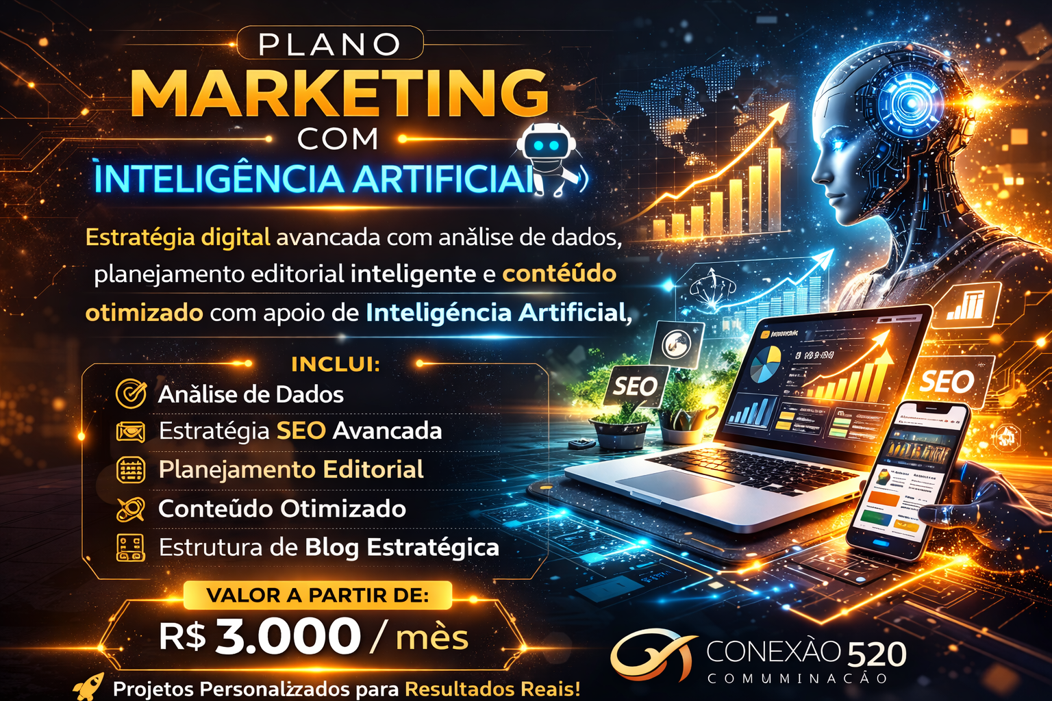 Estratégia digital avançada com análise de dados, planejamento editorial inteligente e conteúdo otimizado com apoio de Inteligência Artificial.Plano Marketing com Inteligência Artificial